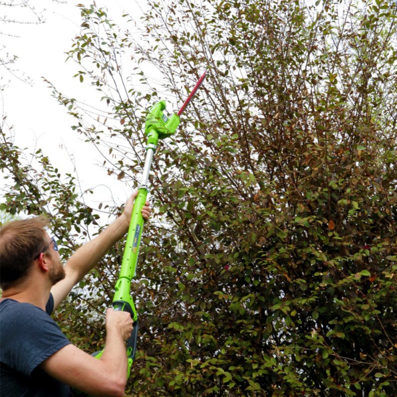 Met de Greenworks G-Max 40 volt accu takkenzaag en heggenschaar op steel (longreach, langbereik) type G40PSH heeft u één steel en twee machines. Een zeer krachtige accu takkenzaag en heggenschaar met een langbereik. Het grote voordeel van snoerloos zagen is uiteraard geen verlengsnoeren en geen brandstof. Dit laatste betekent geen uitlaatgassen en dus ook nog eens milieuvriendelijk werken.