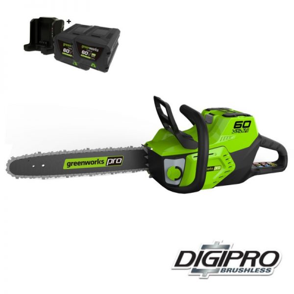 De Greenworks 60 volt accu kettingzaag GD60CS40K2X is de krachtigste accu kettingzaag in het semi-professionele segment kettingzagen. De DIGIPRO koolborstel vrije motor zorgt voor 30% extra vermogen en 70% minder trillingen. De machine is gelijk aan de GD60CS40 maar wordt geleverd inclusief twee 2.0Ah accu’s en 60 Volt lader.