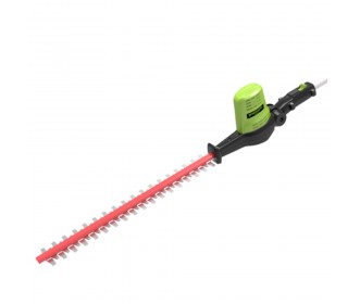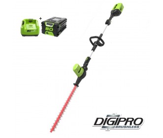 Met de Greenworks 80 Volt heggenschaar op steel (ook wel longreach, langbereik of stok heggenschaar genoemd) type GD80PHTK2 heeft u een zeer krachtige accu heggenschaar met een langbereik. De langbereik heggenschaar is gelijk aan de GD80PHT maar wordt geleverd inclusief 2.0Ah accu en 80 volt lader. Het grote voordeel van snoerloos knippen is uiteraard geen verlengsnoeren, geen lawaai en geen brandstof. Dit laatste betekent geen uitlaatgassen dus ook nog eens milieuvriendelijk knippen. De DIGIPRO koolborstel vrije motor zorgt voor 30% extra vermogen en 70% minder trillingen.